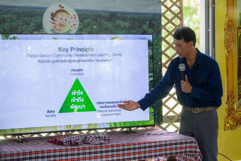 ด้าน คุณดุริยา อมตวิวัฒน์ ผู้อํานวยการศูนย์ระดับภูมิภาคของซีมีโอ ได้กล่าวขอบคุณสวนเทพหยาที่จัดกิจกรรมในวันนี้ คณะ SEAMEO SEPS ได้เห็นความเป็นชุมชนที่มีความหลากหลาย แต่เป็นอันหนึ่งอันเดียวกัน เพราะทุกคนมุ่งมั่นใช้หลักเศรษฐกิจพอเพียงที่บ้านตนเอง หลายบ้านมีอาชีพ มีรายได้ และความชำนาญที่แตกต่างกันแต่ทุกคนในชุมชนเน้นการ “ลดรายจ่าย เพิ่มรายได้” ทำให้ชุมชน มีรายได้ที่ดีและน่าอยู่ ไม่ว่าจะเป็นมิติเรื่องสังคม มิติเศรษฐกิจ และมิติวัฒนธรรม คาดว่า “สวนเทพหยา” เป็นจุดสำคัญในการเป็นศูนย์กลางเชื่อมชุมชน ทำให้ชุมชนเห็นแนวทางปฏิบัติ นำปรัชญาและหลักคิดเศรษฐกิจพอเพียงไปใช้ในชีวิตประจำวันได้จริง ซึ่งปัจจุบันหลักปรัชญาของเศรษฐกิจพอเพียง เป็นแนวคิดที่นานาประเทศให้การยอมรับและมีการน้อมนำไปปรับใช้อย่างแพร่หลาย เพราะเป็นต้นแบบการพัฒนาที่สมดุลและยั่งยืน การเดินทางมาศึกษาดูงานครั้งนี้ จึงเป็นโอกาสสำคัญที่ผู้เชี่ยวชาญจาก 9 ประเทศ จะได้มาเรียนรู้เพิ่มเติมจากพื้นที่จริง เพื่อนำองค์ความรู้ไปขยายผลให้เกิดประโยชน์ต่อผู้คนในประเทศตนเองต่อไป